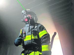 Cascos equipados con un rayo láser y tecnología térmica permite a los bomberos mirar a entre el humo